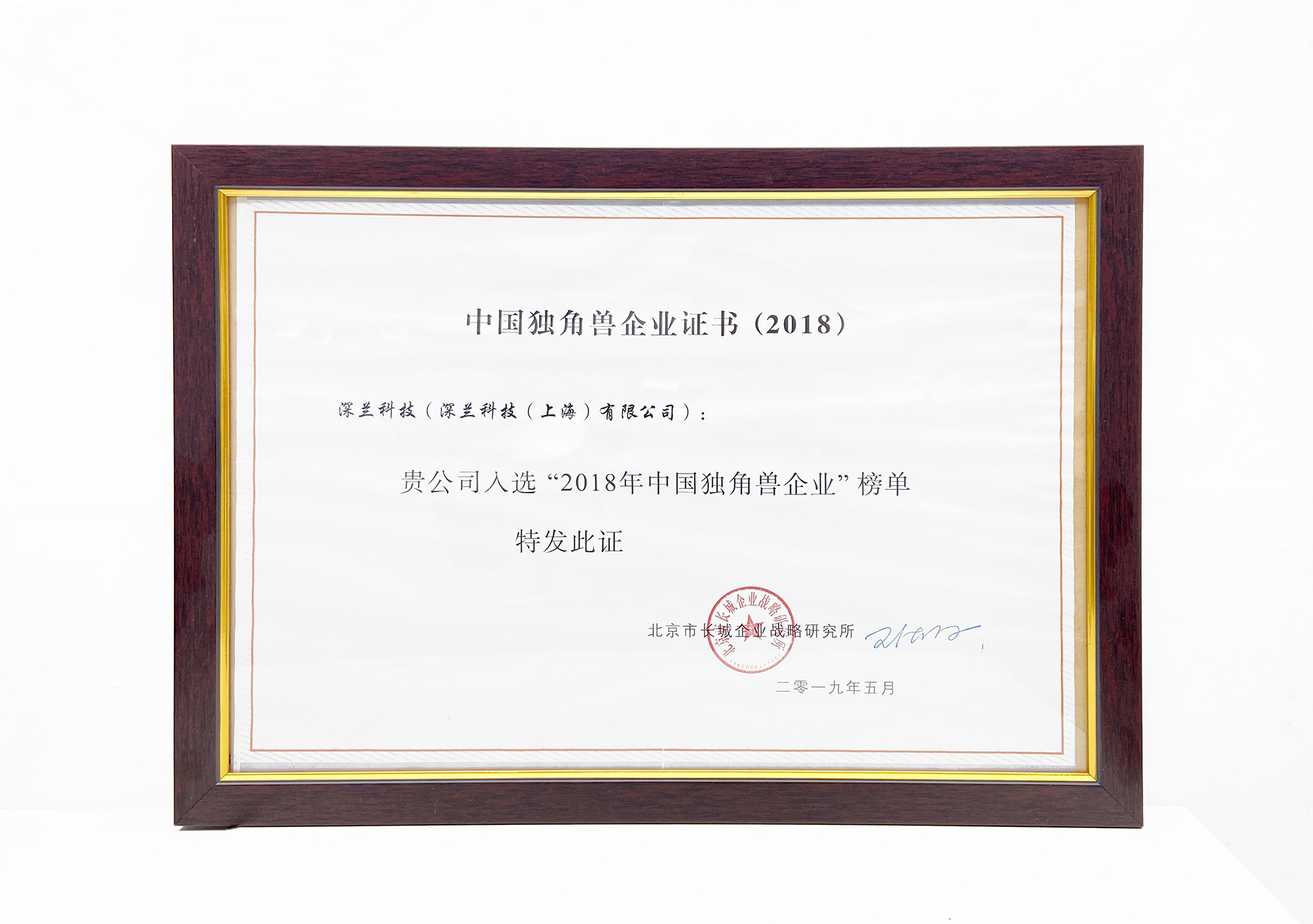 2018 中国独角兽企业证书 北京市长城企业战略研究所