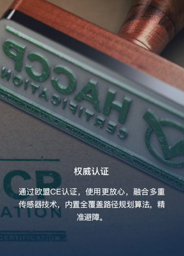 通过欧盟CE认证,使用更放心,融合多重传感器技术,内置全覆盖路径规划算法,精准避障。