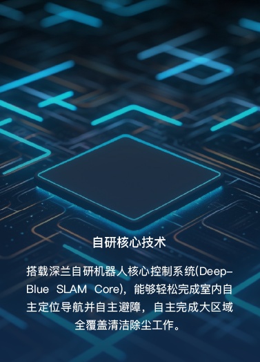搭载深兰自研机器人核心控制系统(DeepBlue SLAM Core),能够轻松完成室内自主定位导航并自主避障,自主完成大区域全覆盖清洁除尘工作。