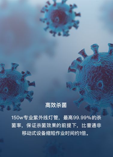 150w专业紫外线灯管,最高99.99%的杀菌率,保证杀菌效果的前提下,比普通非移动式设备缩短作业时间约1倍。