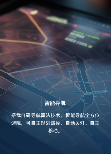 搭载自研导航算法技术,智能导航全方位避障,可自主规划路径、自动关灯、自主移动。