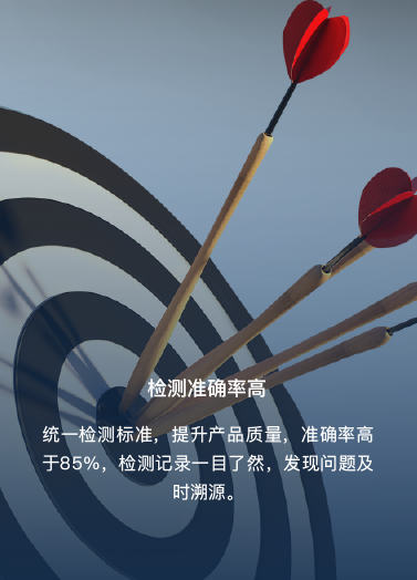 统一检测标准,提升产品质量,准确率高于85%,检测记录一目了然,发现问题及时溯源。