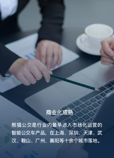 熊猫公交是行业内最早进入市场化运营的智能公交车产品,在上海、深圳、天津、武汉、鞍山、广州、襄阳等十余个城市落地。
